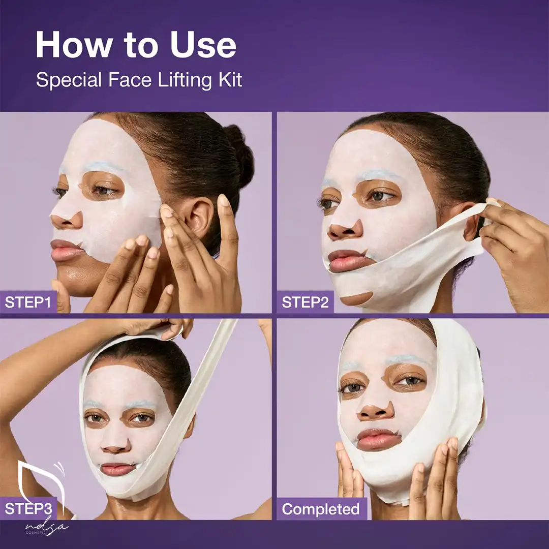 پس از خشک کردن ملایم پوست با حوله تمیز، بسته ماسک را باز کرده و ورقهی ماسک را با دقت از داخل خارج نمایید. سپس آن را بهآرامی روی صورت قرار دهید بهگونهای که کاملاً با فرم صورت هماهنگ شده و تمامی نواحی، بهویژه اطراف گونهها، پیشانی و چانه، بهخوبی پوشش داده شوند. در صورت استفاده از نوع تمامصورت (Full Cover)، میتوانید بخش پایینی ماسک را به ناحیه گردن نیز متصل کنید تا تأثیر لیفتینگ کاملتری ایجاد شود.